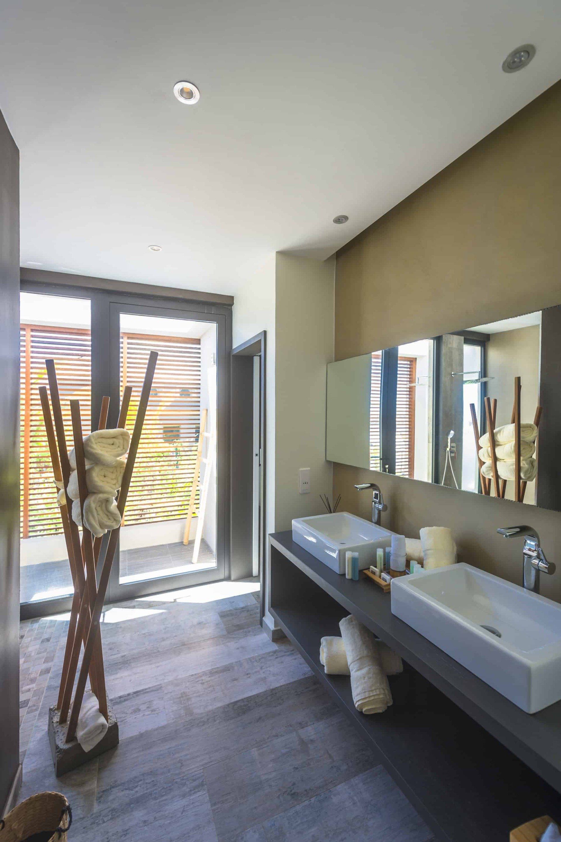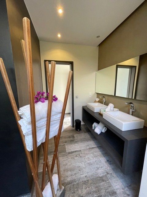 - Large upscale en-suite bathroom with designer water basins for him and hers, a modern open shower with rain shower head